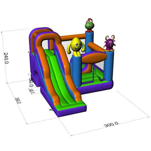 Το Μικρό φουσκωτό κάστρο με τσουλήθρα για παιδιά - τέρατα είναι μια ατραξιόν για όλους τους λάτρεις του χαρούμενου άλματος. Τα παιδιά διασκεδάζουν υπέροχα – πηδούν και υποδύονται ρόλους που ταιριάζουν στο θέμα της ατραξιόν. Το Μικρό φουσκωτό κάστρο με τσουλήθρα για παιδιά - τέρατα έχει σχεδιαστεί όχι μόνο για πολύ μικρά παιδιά. Τα φουσκωτά αυτής της κατηγορίας είναι συνήθως πλούσια διακοσμημένα και περιέχουν πολλά στοιχεία που προσκαλούν σε ξέγνοιαστο άλμα στον καθαρό αέρα. Τα φουσκωτά κάστρα μπορούν να δημιουργήσουν έναν φανταστικό κόσμο εμπειριών μέσα από χαρούμενα άλματα με φίλους και συνομηλίκους. Το φουσκωτό κάστρο μπορεί να συνδυαστεί με άλλα προϊόντα από την προσφορά μας, δημιουργώντας έτσι έναν μαγικό, παραμυθένιο κόσμο εμπειριών για ώρες διασκέδασης και χαράς.