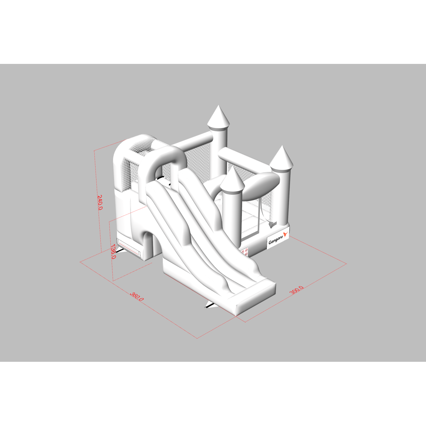 Όπως όλες οι φουσκωτές ατραξιόν μας, το προϊόν είναι κατασκευασμένο από υλικά υψηλής ποιότητας – σε αυτή την περίπτωση από PVC νέας γενιάς με υψηλή αντοχή στο σκίσιμο. Το Κάστρο Bouncy με τσουλήθρα σε λευκό θέμα έχει διαστάσεις 3,6 m x 3 m x 2,4 m (μήκος, πλάτος και ύψος). Πληροί το πρότυπο ασφαλείας EN 14960 για φουσκωτό εξοπλισμό ψυχαγωγίας. Συνιστούμε τη χρήση φυσητήρων για το φούσκωμα – τους περιλαμβάνουμε στο σετ. Όπως οι περισσότερες από τις ατραξιόν μας, το φουσκωτό καλύπτεται από διετή εγγύηση. Στη Gangaru φροντίζουμε να έχεις όσο το δυνατόν λιγότερες έγνοιες – με το φουσκωτό παρέχουμε πλήρες σετ αξεσουάρ για τη στερέωση της ατραξιόν (σχοινιά, πασαλάκια). Το φουσκωτό έχει ελεγχθεί ως προς την ασφάλεια από ανεξάρτητο πραγματογνώμονα.