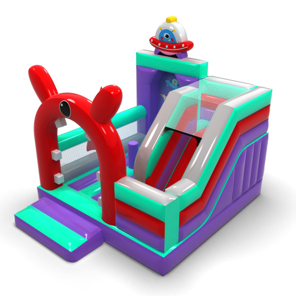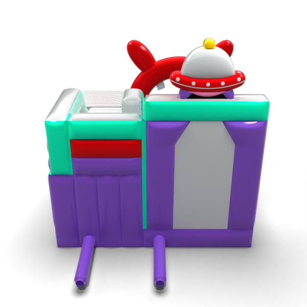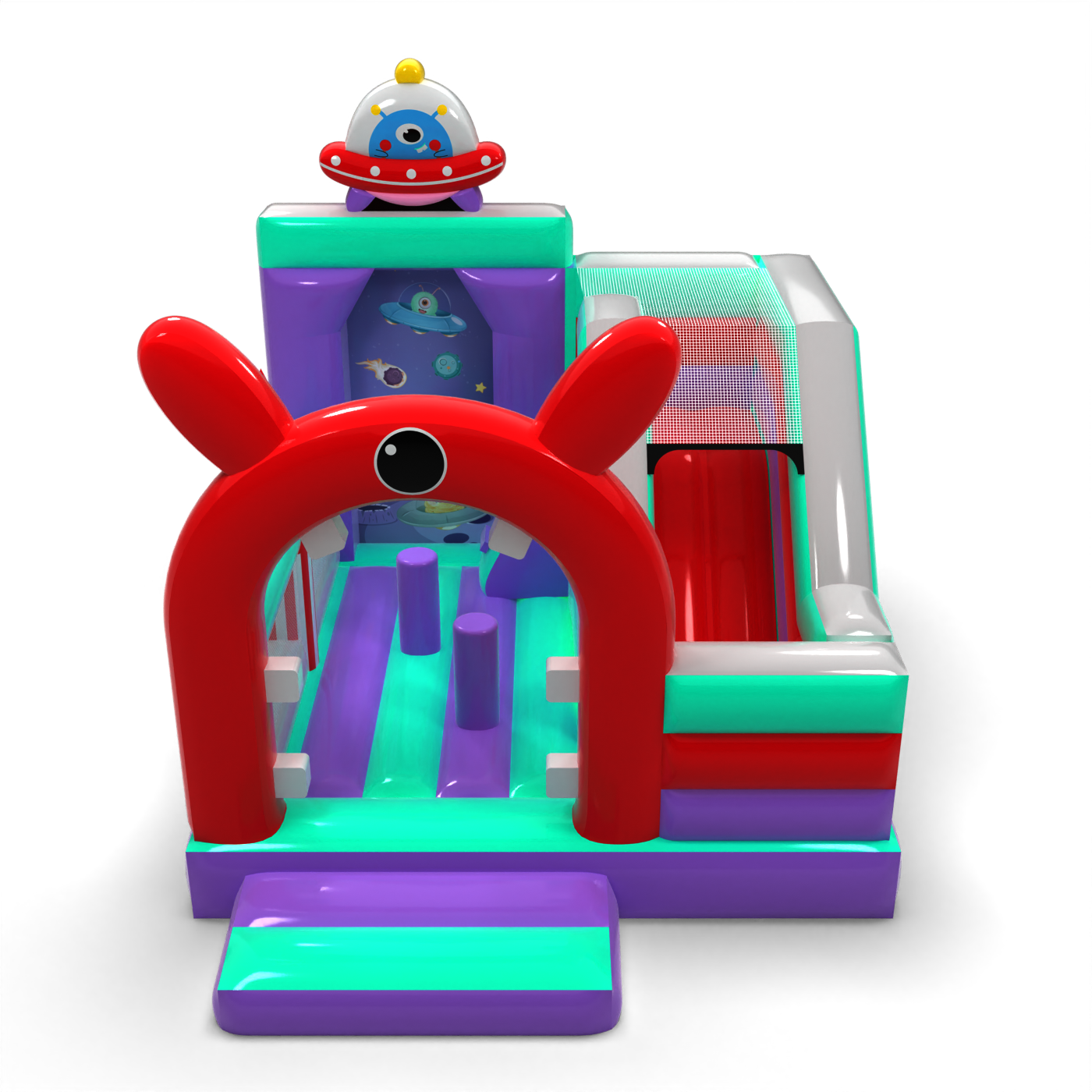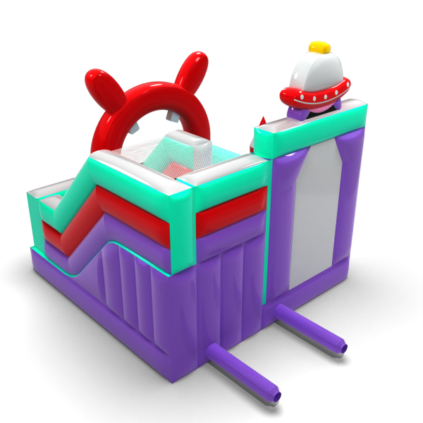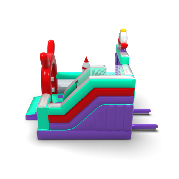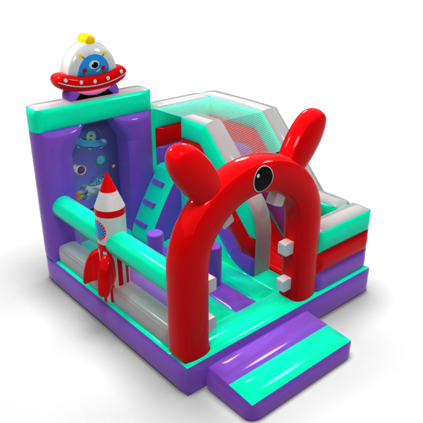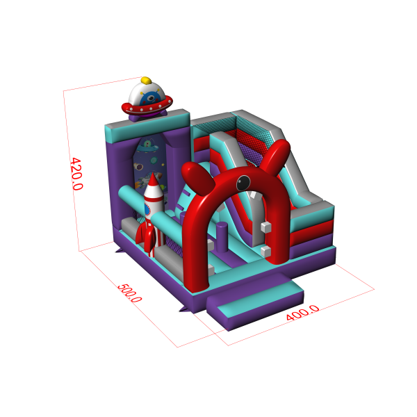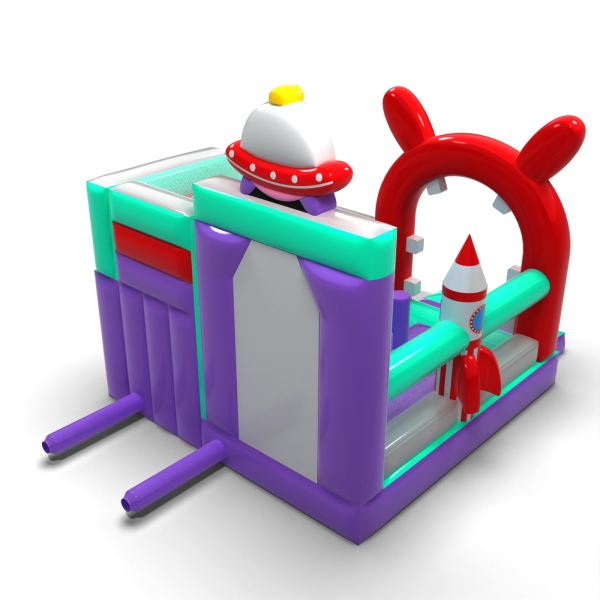 Ο διογκώσιμος συνδυασμός με θέμα το διάστημα συνδυάζει τις λειτουργίες ενός κάστρου, ενός χώρου για άλματα και μιας τσουλήθρας, καθιστώντας το ένα εξαιρετικά ευέλικτο αξιοθέατο για τα παιδιά. Το μοτίβο του πυραύλου και των ufools είναι εντυπωσιακό και ιδανικό για σύγχρονα σενάρια εκδηλώσεων. Ο σχεδιασμός επιτρέπει σε πολλά παιδιά να παίζουν ταυτόχρονα, γεγονός που μεταφράζεται σε υψηλή αποδοτικότητα κατά την ενοικίαση. Μια εξαιρετική επιλογή για υπαίθριες εκδηλώσεις, θεματικά πικνίκ και εκδηλώσεις σε εσωτερικούς χώρους.