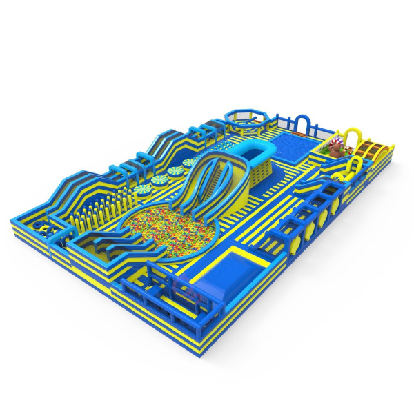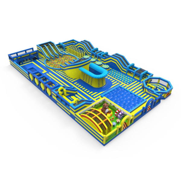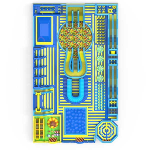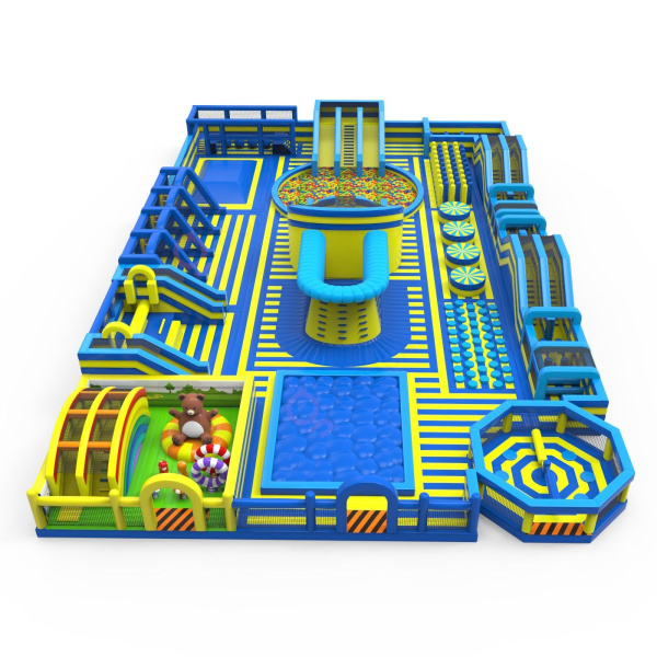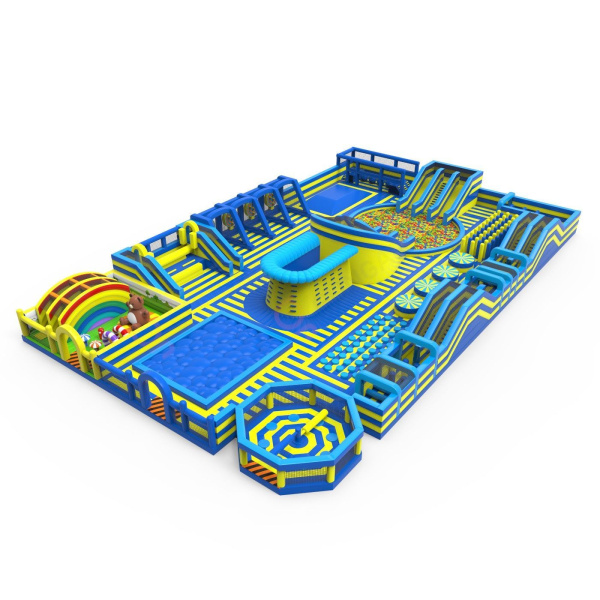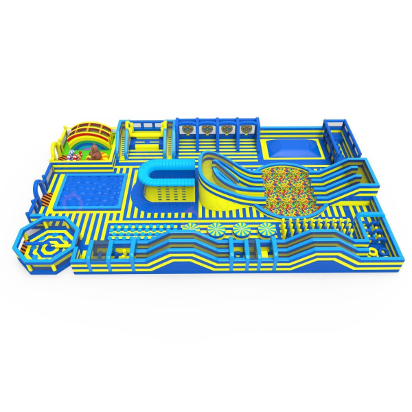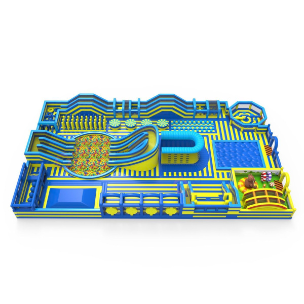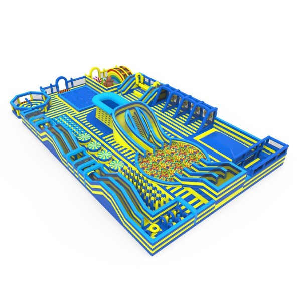 Φουσκωτό θεματικό πάρκο σε μπλε και κίτρινο χρώμα έχει κατασκευαστεί με τέτοιον τρόπο ώστε να προσφέρει διασκέδαση σχεδόν σε όλους. Ο χρόνος που περνάμε με τα αγαπημένα μας πρόσωπα είναι ακόμα πιο ευχάριστος. Δοκιμάστε όλες τις δραστηριότητες και ανακαλύψτε την αγαπημένη σας. Το φουσκωτό πάρκο διασκέδασης μπορεί να εμπλουτιστεί με επιπλέον τσουλήθρες, μαξιλάρια για άλματα, πισίνες με μπάλες, μαλακή πλαγιά ή το φαινόμενο wipeout. Ο εντυπωσιακός χώρος για την οργάνωση διάφορων παιχνιδιών είναι αναμφισβήτητα το πλεονέκτημα του φουσκωτού πάρκου διασκέδασης. Στις διάφορες ζώνες αυτής της δραστηριότητας, μπορείτε να ανταγωνιστείτε με τους φίλους σας ή να αγωνιστείτε σε αγώνες με φουσκωτές μπάλες. Το φουσκωτό πάρκο διασκέδασης είναι ένα ολοκληρωμένο έργο που μπορεί να τροποποιηθεί και να προσαρμοστεί κατά βούληση. Με αυτή τη λύση, μπορείτε να έχετε ένα μοναδικό και μοναδικό φουσκωτό πάρκο διασκέδασης.