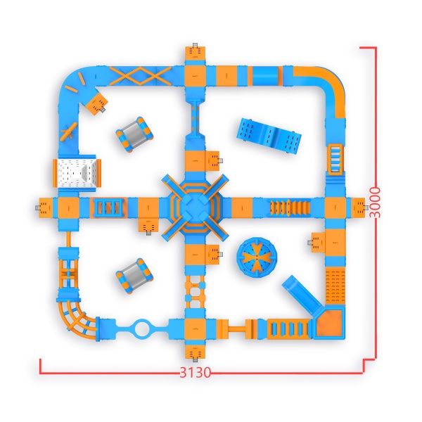 Wysoka wieża narożna ze wspinaczką i zjeżdżalnią - to element, który wyróżnia Pi spośród parków w tej klasie wielkości. W centrum czeka konstrukcja z czterema zjeżdżalniami, a na trasie znajdziesz m.in. białą ściankę wspinaczkową, kule, kołowrotki, mostki i równoważnie. Układ z centralnym węzłem i obwodową ścieżką przeszkód daje właścicielowi pełną kontrolę nad przepływem nawet 90-osobowej grupy. Sprawdza się na średnich akwenach, gdzie liczy się maksymalne wykorzystanie dostępnej powierzchni.