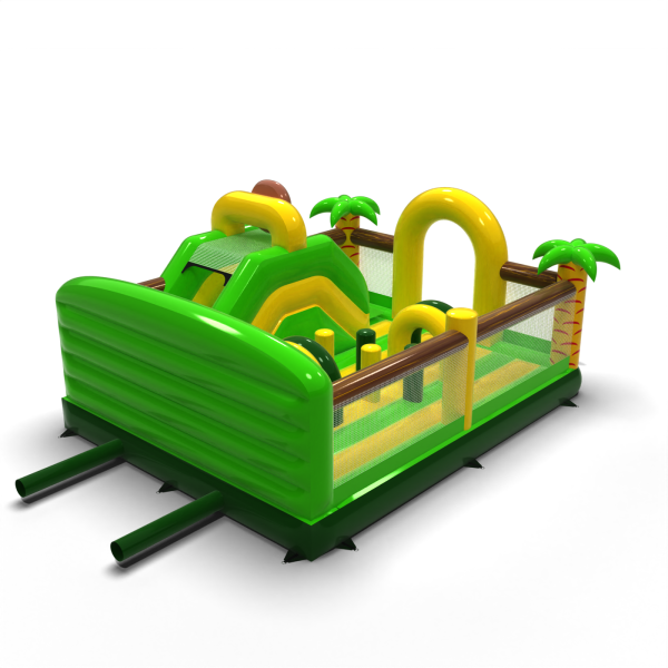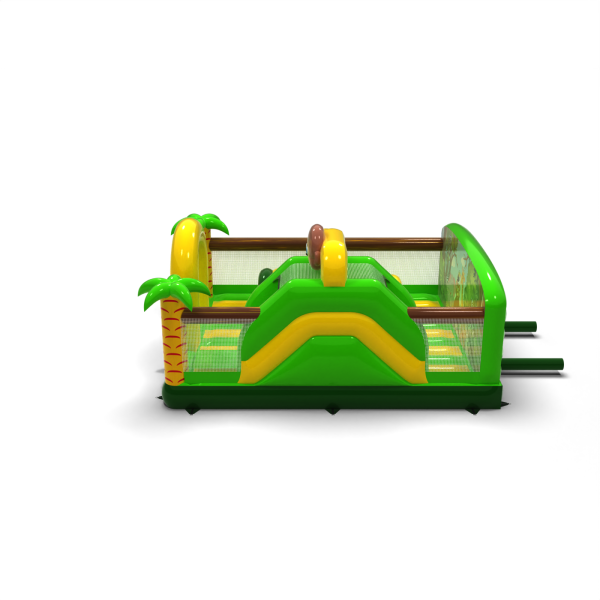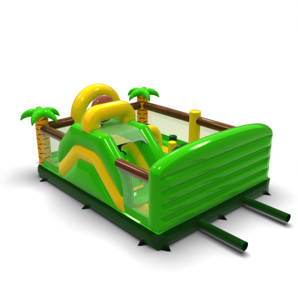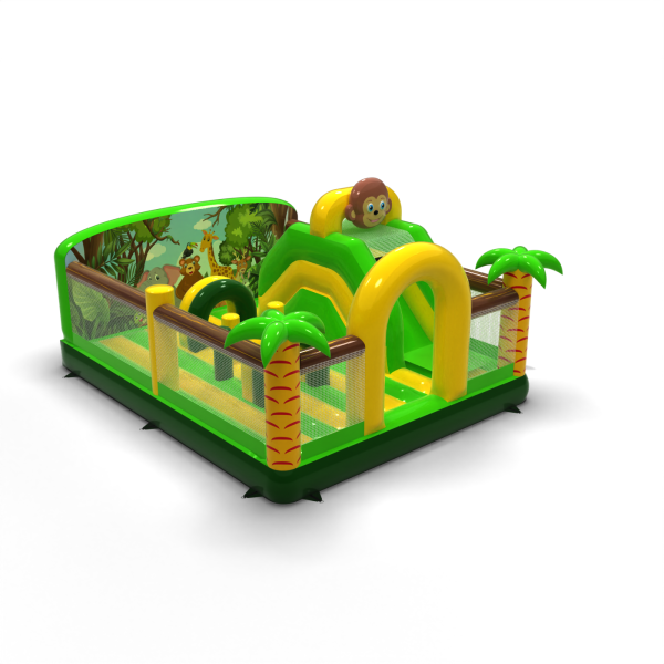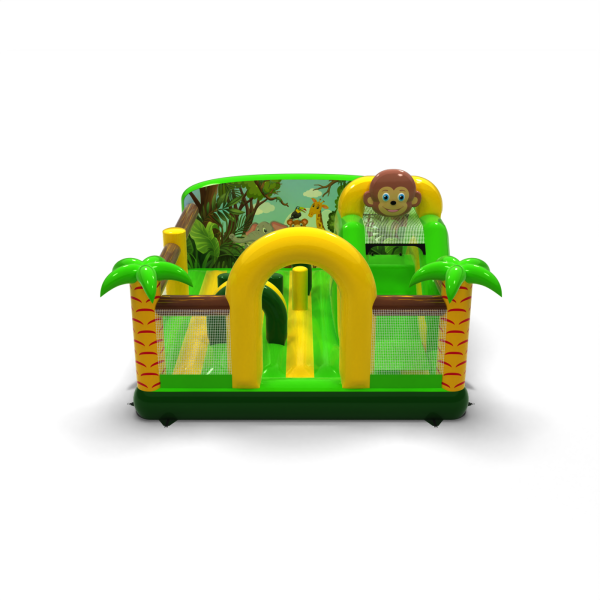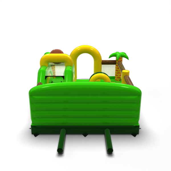 Η διογκώσιμη παιδική χαρά 6x5 σε ένα θέμα ζούγκλας είναι η ιδανική έλξη για θεματικά πάρκα, υπαίθριες περιοχές και οικογενειακές εκδηλώσεις. Το πράσινο και κίτρινο χρώμα, ο φοίνικας και ο χαμογελαστός πίθηκος δημιουργούν ένα συνεκτικό σκηνικό που τραβάει αμέσως τα βλέμματα των παιδιών. Ο σχεδιασμός συνδυάζει μια διαδρομή εμποδίων, μια τσουλήθρα και έναν χώρο αναπήδησης για δυναμικό παιχνίδι σε ένα ασφαλές περιβάλλον. Τα διαφανή δίχτυα διευκολύνουν την παρακολούθηση της ομάδας, ενώ η συμπαγής μορφή επιτρέπει τον αποτελεσματικό χειρισμό ακόμη και σε συνθήκες έντονης κυκλοφορίας. Επιλέξτε ένα θέμα που μετατρέπει κάθε εκδήλωση σε μια πραγματική περιπέτεια μέσα στην άγρια φύση.