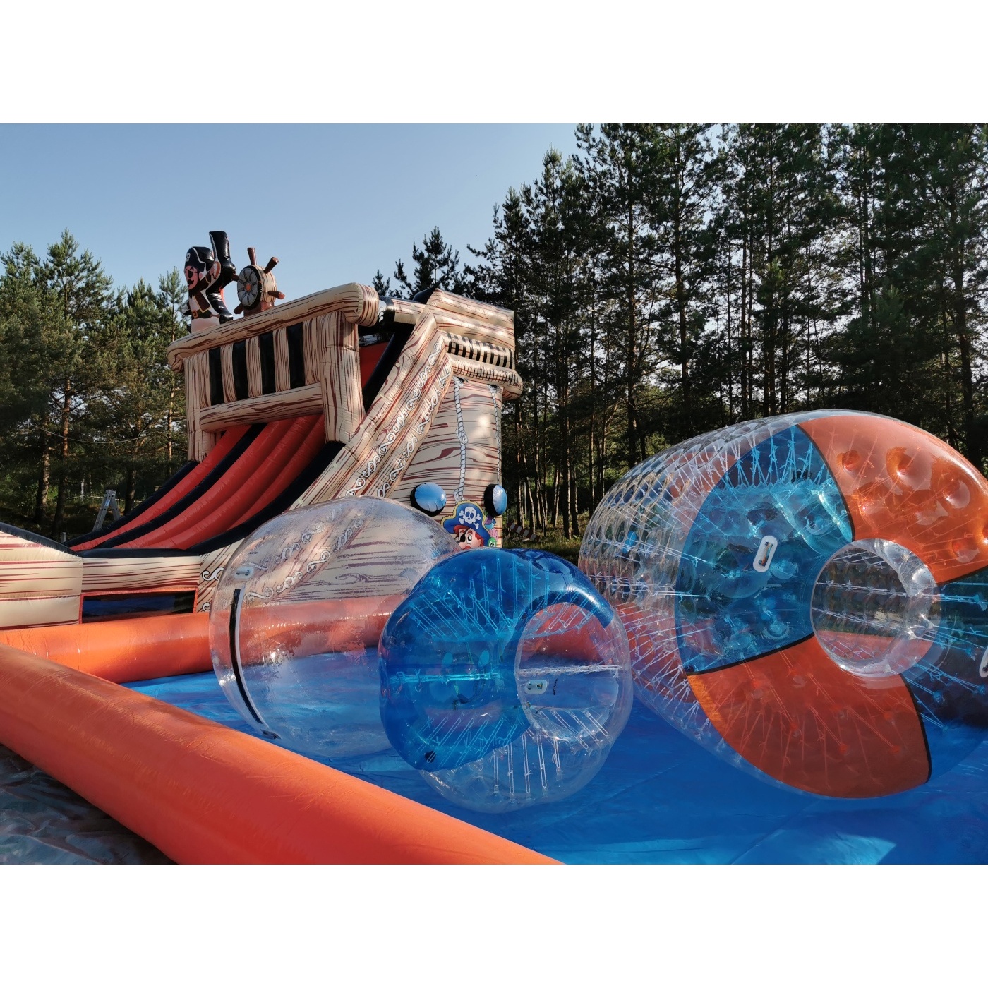 Το Φουσκωτή πισίνα με μπάλα νερού 5 x 5 m είναι ένα αξιοθέατο αφιερωμένο στους λάτρεις των υδάτινων περιπετειών και της διασκέδασης κάθε ηλικίας. Οι φουσκωτές υδάτινες πισίνες αποτελούν αναπόσπαστο μέρος άλλων εξίσου ελκυστικών στοιχείων του φουσκωτού υδάτινου πάρκου, όπως οι υδάτινοι κύλινδροι και οι μπάλες νερού. Η υδάτινη ψυχαγωγία με τη μορφή πισίνας επιτρέπει στους συμμετέχοντες μιας εταιρικής εκδήλωσης, ενός φεστιβάλ ή μιας υπαίθριας συγκέντρωσης να δροσιστούν. Τα φουσκωτά με νερό δημιουργήθηκαν με στόχο να εμπλουτίσουν τις συναντήσεις παιδιών και εφήβων. Η φουσκωτή υδάτινη πισίνα μπορεί να αποτελέσει απόλυτο χιτ για σχεδόν κάθε άτομο που λατρεύει να περνά χρόνο στην ύπαιθρο, τα μακρά καλοκαιρινά απογεύματα και τα ζεστά βράδια.