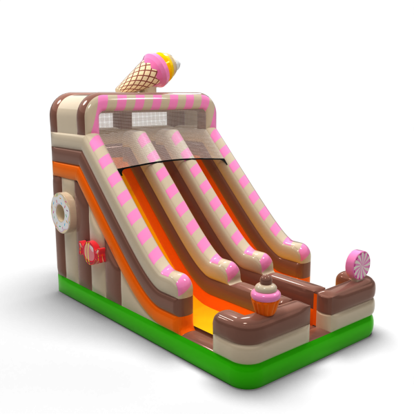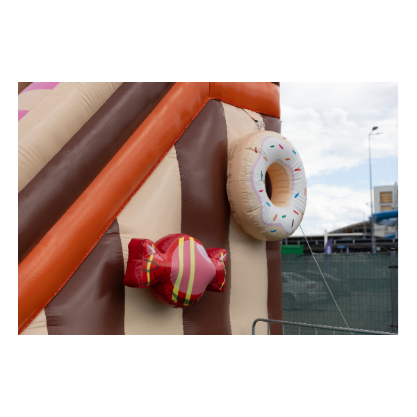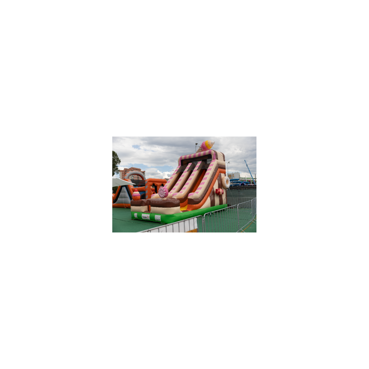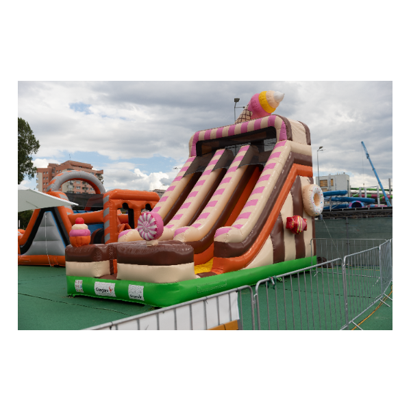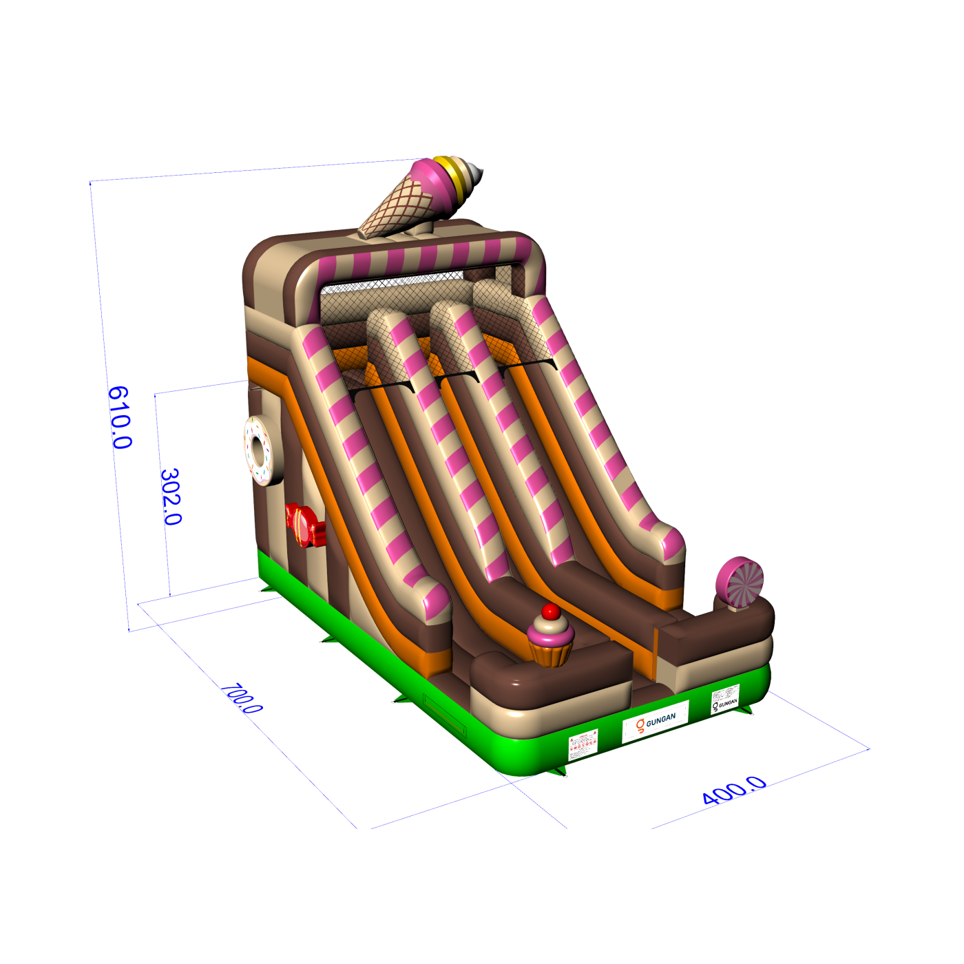 Η διπλή διογκώσιμη τσουλήθρα με θέμα τα γλυκά είναι ένα μοναδικό αξιοθέατο που θα κάνει κάθε εκδήλωση μια πολύχρωμη γιορτή χαράς! Με γλυκές παστέλ διακοσμήσεις, αυτή η φουσκωτή ενθαρρύνει τα παιδιά να πηδήξουν, να γλιστρήσουν και να ανακαλύψουν τον μαγικό κόσμο της καραμέλας. Ιδανικό για φεστιβάλ, γενέθλια και άλλες υπαίθριες εκδηλώσεις, αυτό το προϊόν θα προσφέρει αξέχαστες στιγμές διασκέδασης σε ένα ασφαλές περιβάλλον, όπου τα μικρά παιδιά μπορούν να εκπληρώσουν τα όνειρά τους για γλυκιά περιπέτεια!
