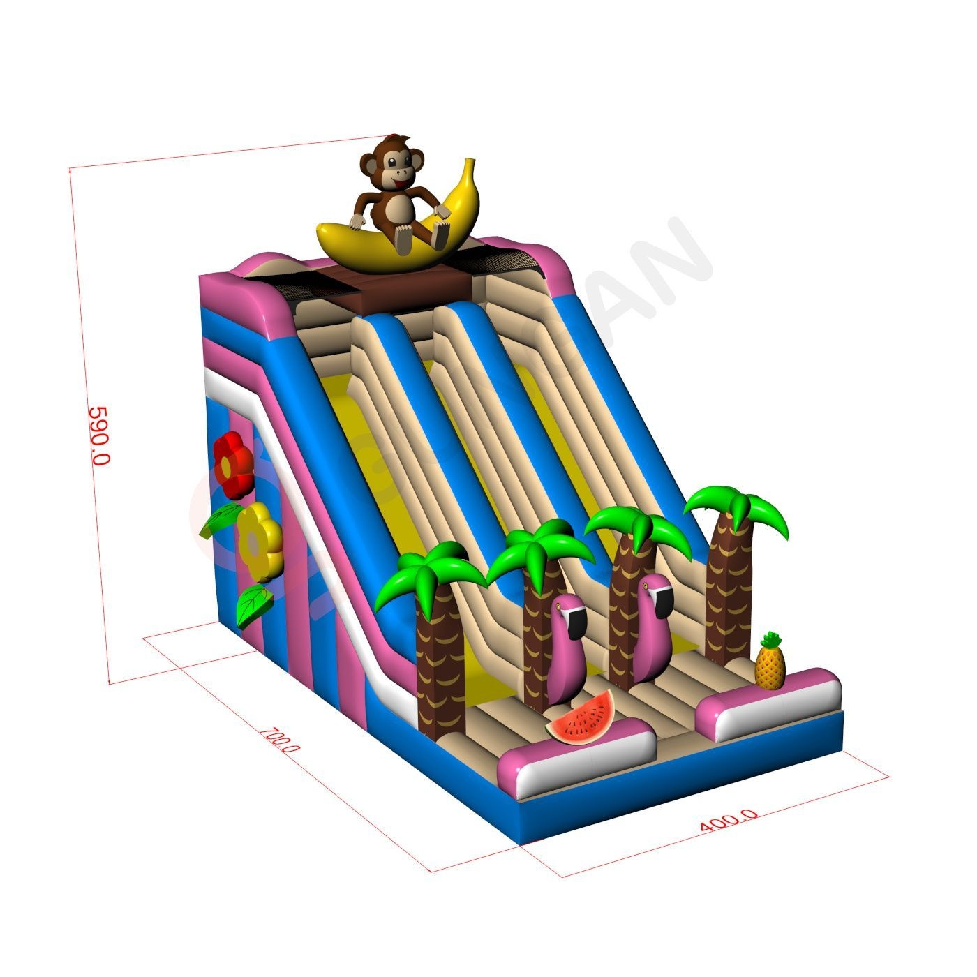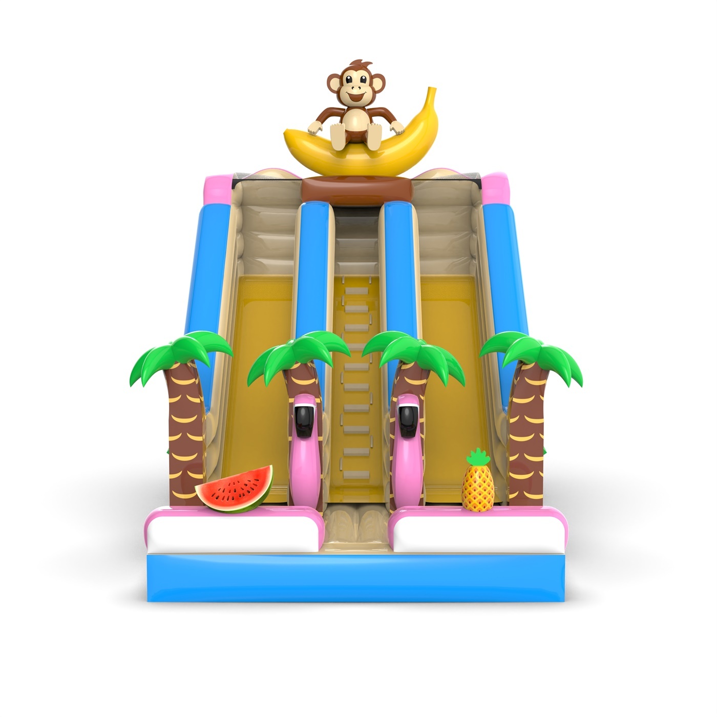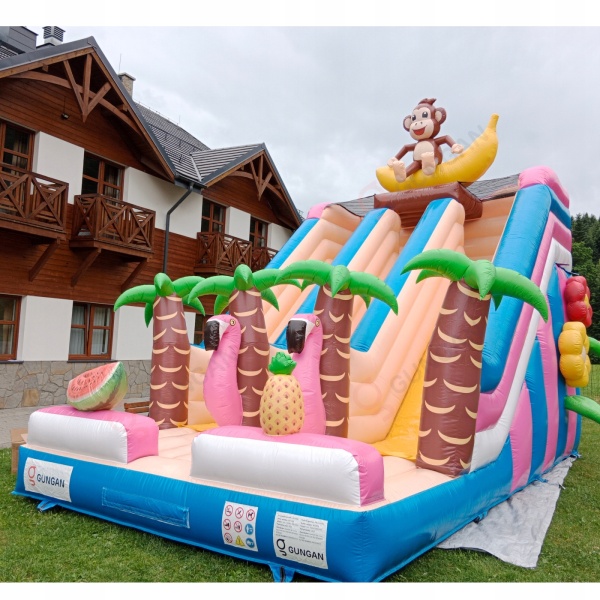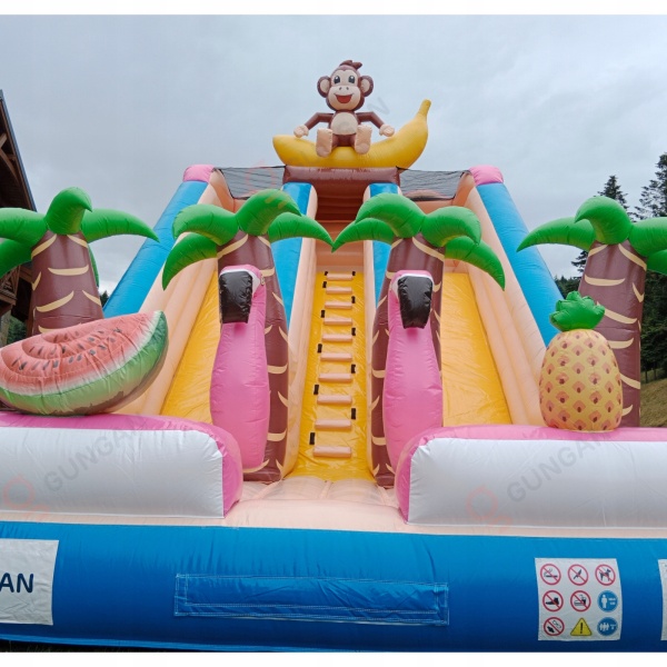 Μεταφέρετε τα παιδιά σε ένα εξωτικό νησί με τη διπλή διογκώσιμη τσουλήθρα μας με θέμα τη Χαβάη! Γεμάτη πολύχρωμους φοίνικες και τροπικά στοιχεία, θα χαρίσει στα μικρά παιδιά πολλή διασκέδαση και περιπέτειες διακοπών. Ιδανική για υπαίθριες εκδηλώσεις, φεστιβάλ και πικνίκ, αυτή η τσουλήθρα θα μεταφέρει την εκδήλωσή σας σε έναν πραγματικό παράδεισο διασκέδασης!