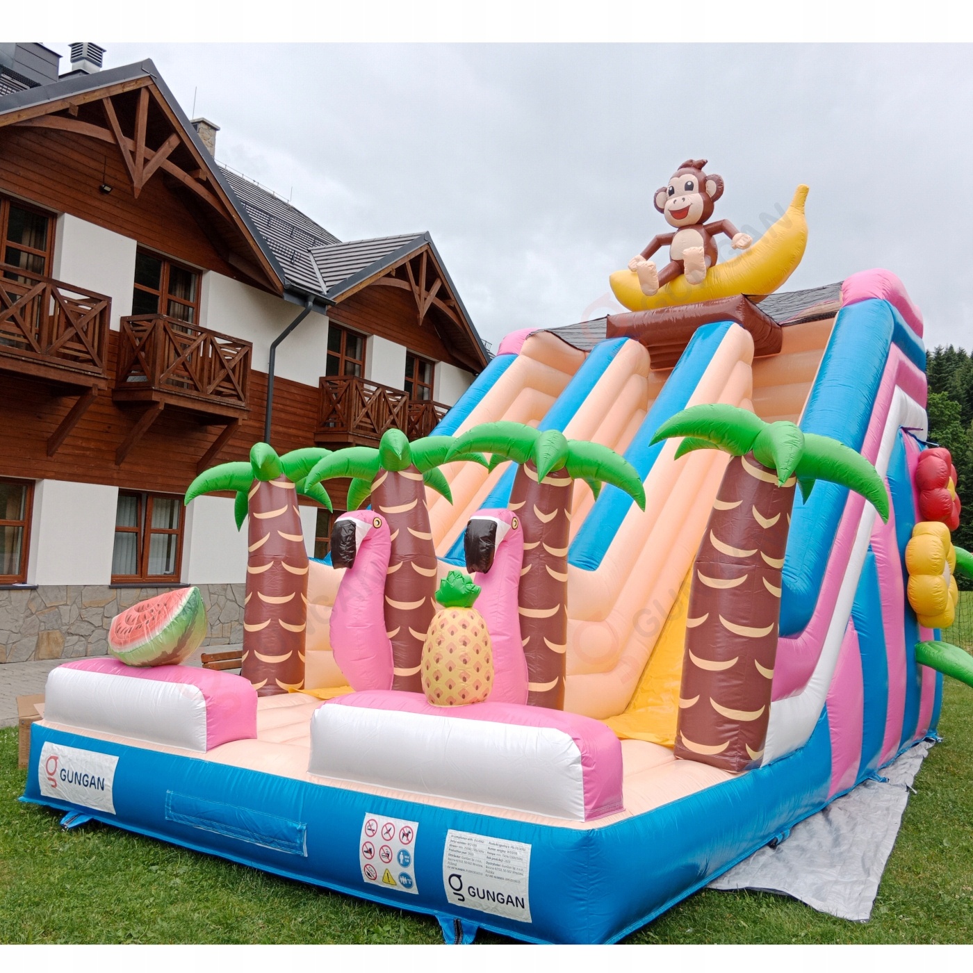Όπως όλες οι φουσκωτές ατραξιόν μας, το προϊόν είναι κατασκευασμένο από υλικά υψηλής ποιότητας – σε αυτή την περίπτωση, από PVC νέας γενιάς με υψηλή αντοχή σε σκισίματα. Το Διπλή φουσκωτή τσουλήθρα με χαβανέζικο θέμα έχει διαστάσεις 7 m x 4 m x 5,9 m (μήκος, πλάτος και ύψος). Πληροί το πρότυπο ασφαλείας EN 14960 για φουσκωτό εξοπλισμό ψυχαγωγίας. Συνιστούμε τη χρήση φυσητήρων, οι οποίοι περιλαμβάνονται στο σετ. Όπως τα περισσότερα προϊόντα μας, το φουσκωτό καλύπτεται από διετή εγγύηση. Στην Gangaru φροντίζουμε ώστε να μην ανησυχείς για τίποτα – παρέχουμε πλήρες σετ αξεσουάρ για την τοποθέτηση της ατραξιόν (σχοινιά, πασαλάκια). Το φουσκωτό έχει ελεγχθεί ως προς την ασφάλεια από ανεξάρτητο εμπειρογνώμονα.