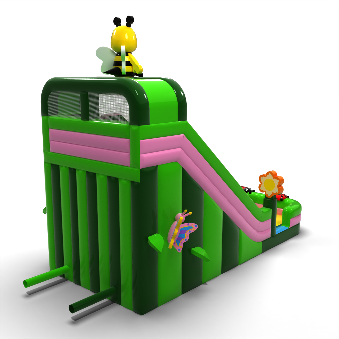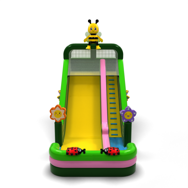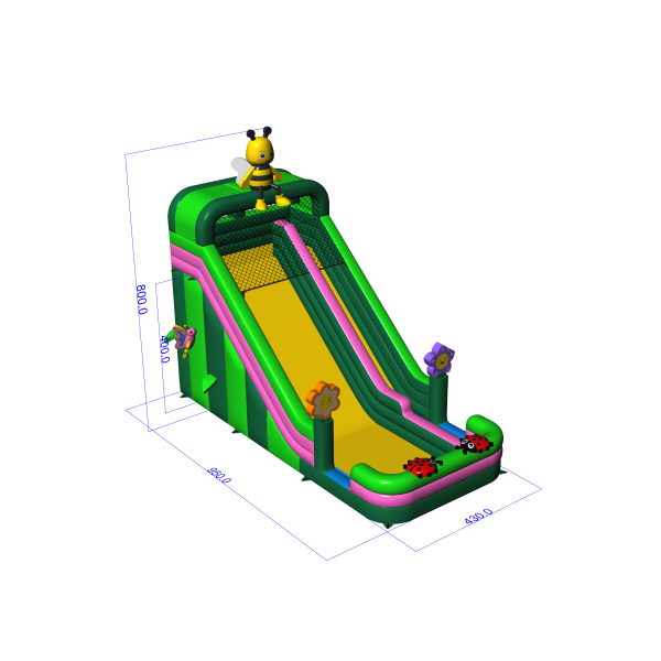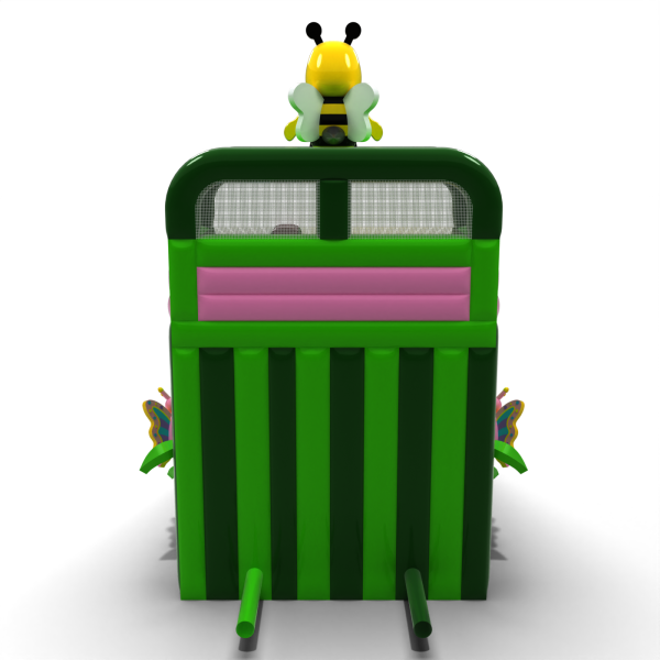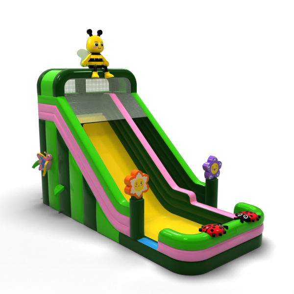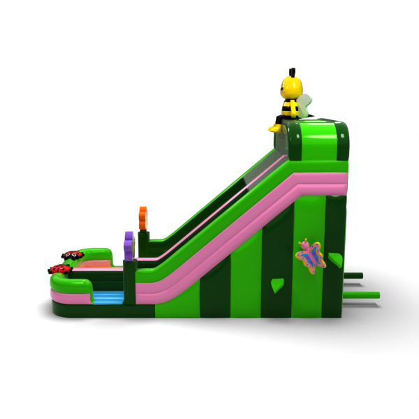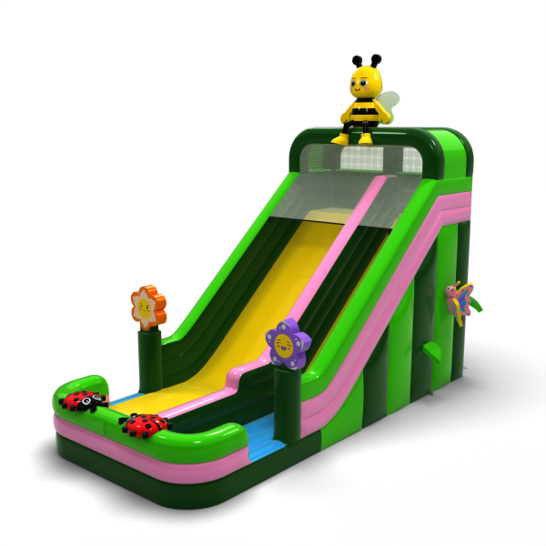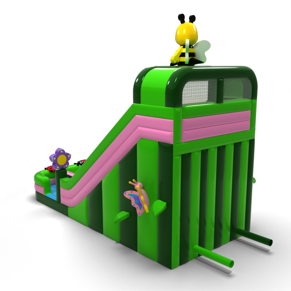 Μια τσουλήθρα με μοτίβο ανοιξιάτικο λιβάδι με μια μέλισσα, λουλούδια και πασχαλίτσες είναι η τέλεια ατραξιόν για τους μικρότερους συμμετέχοντες σε οικογενειακές εκδηλώσεις και υπαίθρια πικνίκ. Ο χρωματικός συνδυασμός με βάση το πράσινο και το ροζ δημιουργεί μια φιλική αισθητική που λειτουργεί ιδιαίτερα καλά σε περιβαλλοντικά ή θεματικά σενάρια. Η ψηλή τσουλήθρα και η φαρδιά πίστα εξασφαλίζουν έντονη διασκέδαση καθ' όλη τη διάρκεια της ημέρας. Μια εξαιρετική επιλογή για εταιρείες με έμφαση στον εντυπωσιακό σχεδιασμό και την υψηλή ικανότητα έλξης.