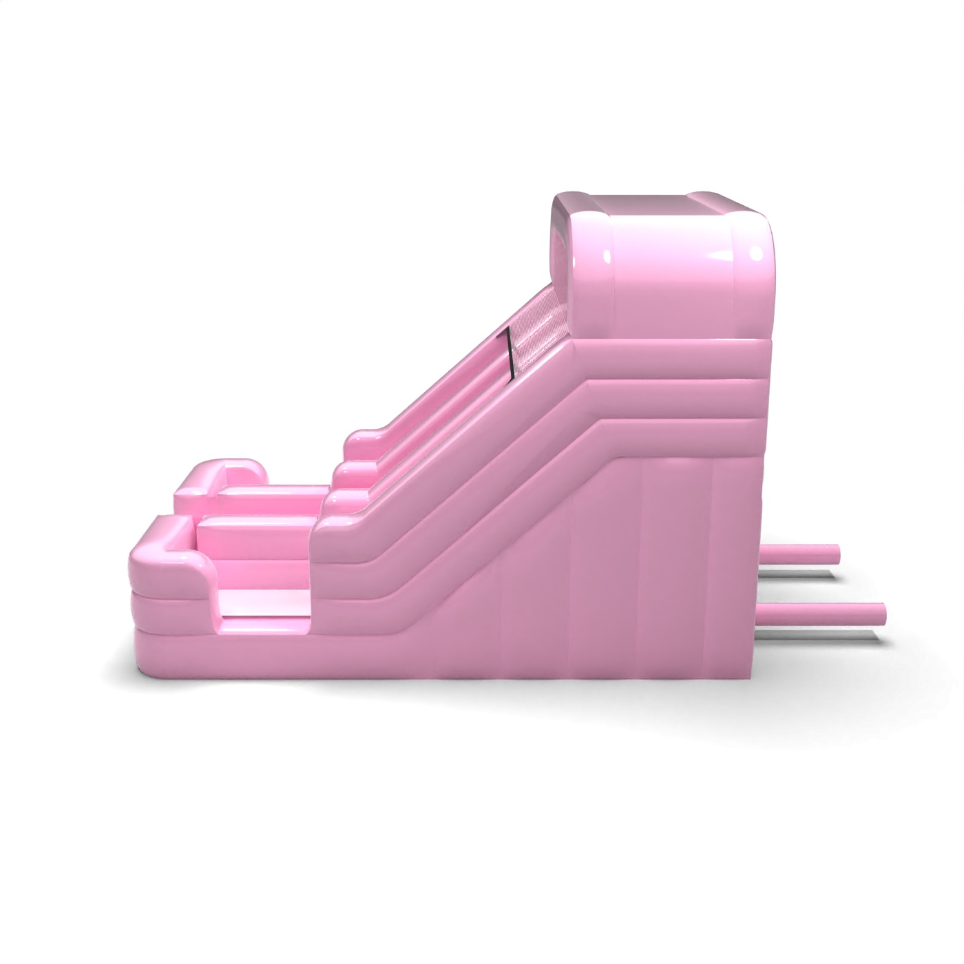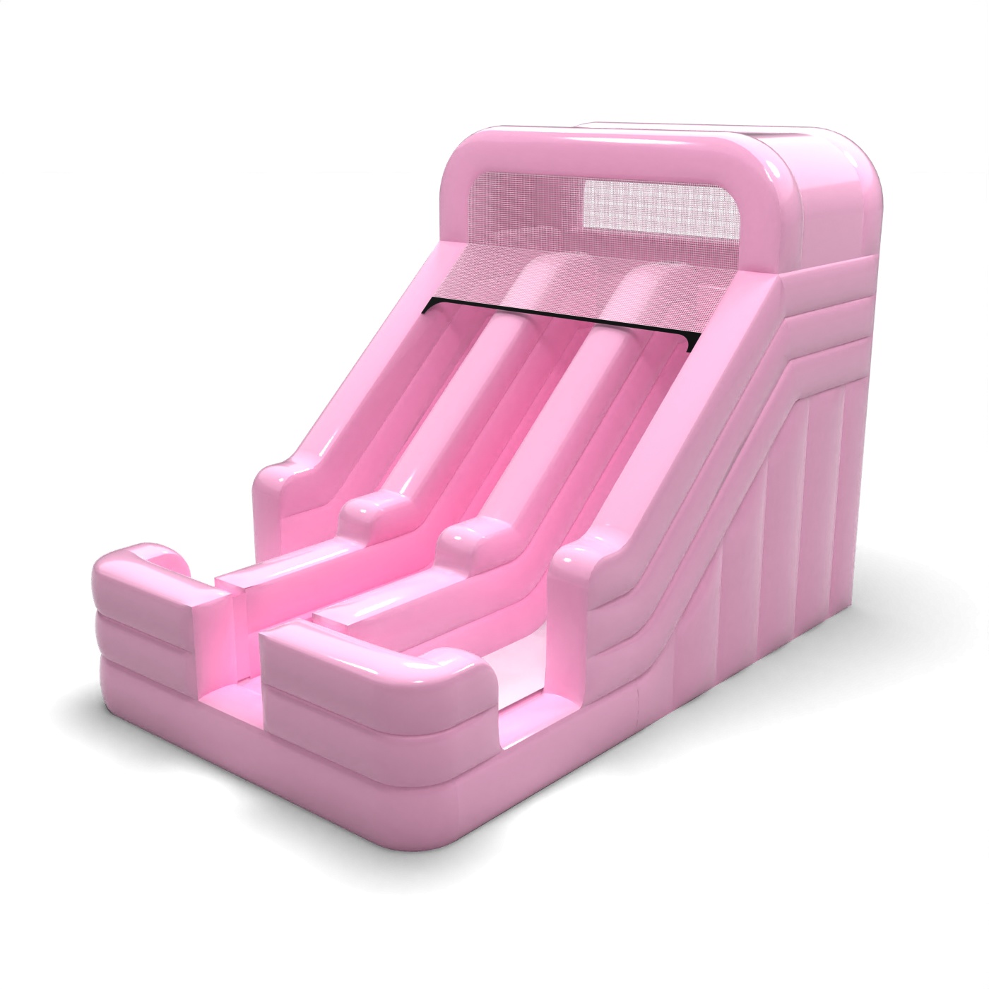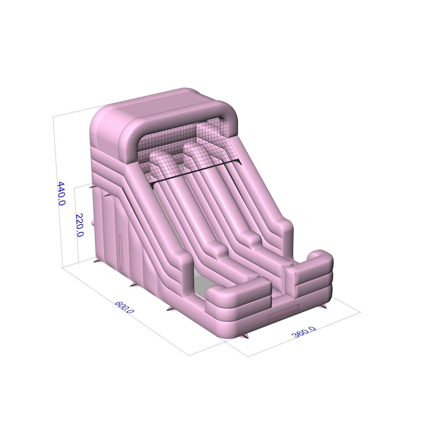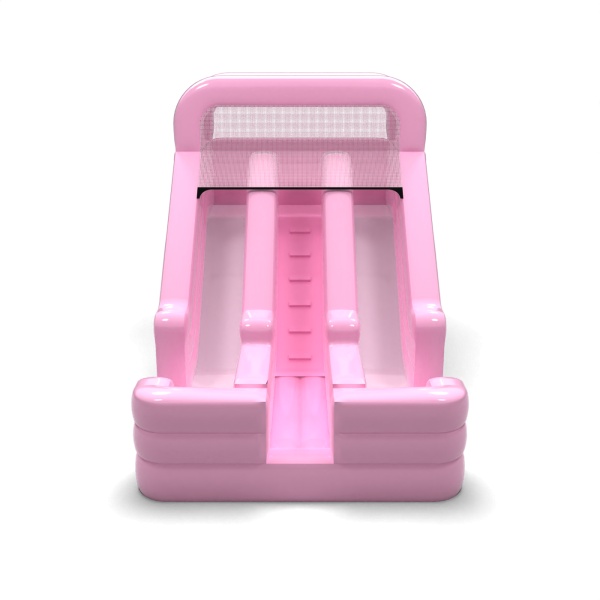 Το ροζ σε σκόνη δίνει σε αυτή την τσουλήθρα δύο διαδρομών μια ανάλαφρη, αρμονική εμφάνιση που ταιριάζει καλά σε ήσυχα οικογενειακά περιβάλλοντα. Οι δύο ανεξάρτητες πίστες επιτρέπουν το παράλληλο παιχνίδι, διευκολύνοντας τον χειρισμό μιας μεγαλύτερης ομάδας παιδιών σε σύντομο χρονικό διάστημα. Η απλή, συμμετρική μορφή καθιστά τη δομή οπτικά ξεκάθαρη και εύκολη στην τοποθέτηση στην καθορισμένη ζώνη εμψύχωσης. Πρόκειται για ένα μοντέλο που είναι ιδιαίτερα ελκυστικό για εταιρείες ενοικίασης που φροντίζουν για πάρτι στον κήπο, εκδηλώσεις προσχολικής ηλικίας και οικείες υπαίθριες παραγωγές. Η διαφάνεια θα βρει καλύτερα τη θέση της εκεί όπου είναι σημαντικά τα διακριτικά χρώματα, η καλή οργάνωση της κίνησης και η αισθητική συνοχή της εκδήλωσης.